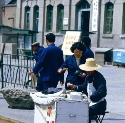 图为一个大爷在大街上摆摊卖冰棍,